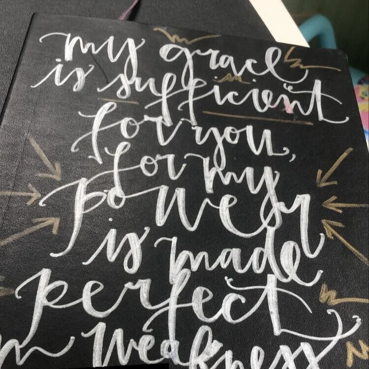 The verse on the front of my journal reminds me that His grace IS sufficient. His power IS perfect. I’m weak, that’s for sure, so “I will boast all the more about my weaknesses, so that Christ’s power may rest on me.”